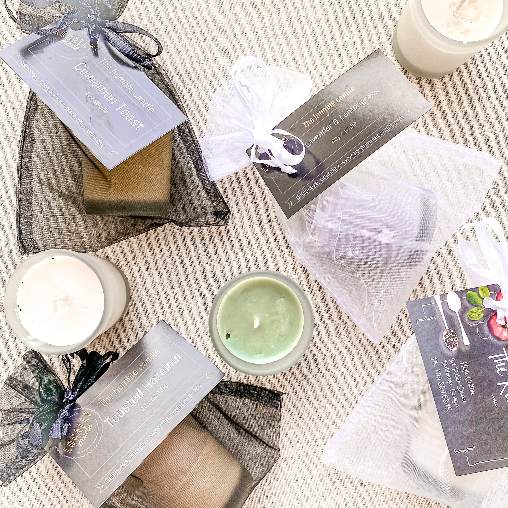 Our very own top-selling Humble Candle votives have a cotton wick and are poured with 100% soy wax right here in our little corner shoppe! Each glass votive is individually wrapped!